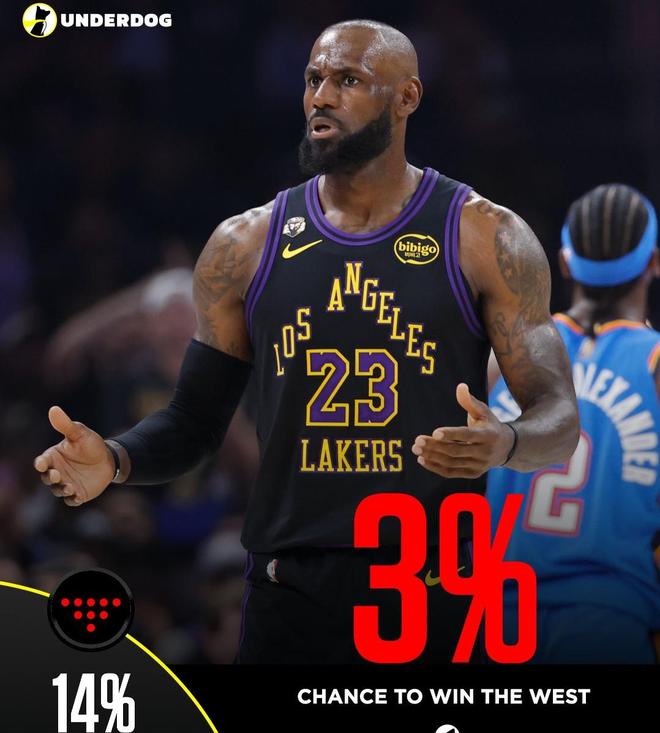湖人赢得西部冠军的概率一路从14%迅速暴跌至3%,从基础得分数据也不难解释为何东契奇与里夫斯的报销影响如此之大,开赛至今两人场均可以砍下57分,占了球队场均得分的48.9%。