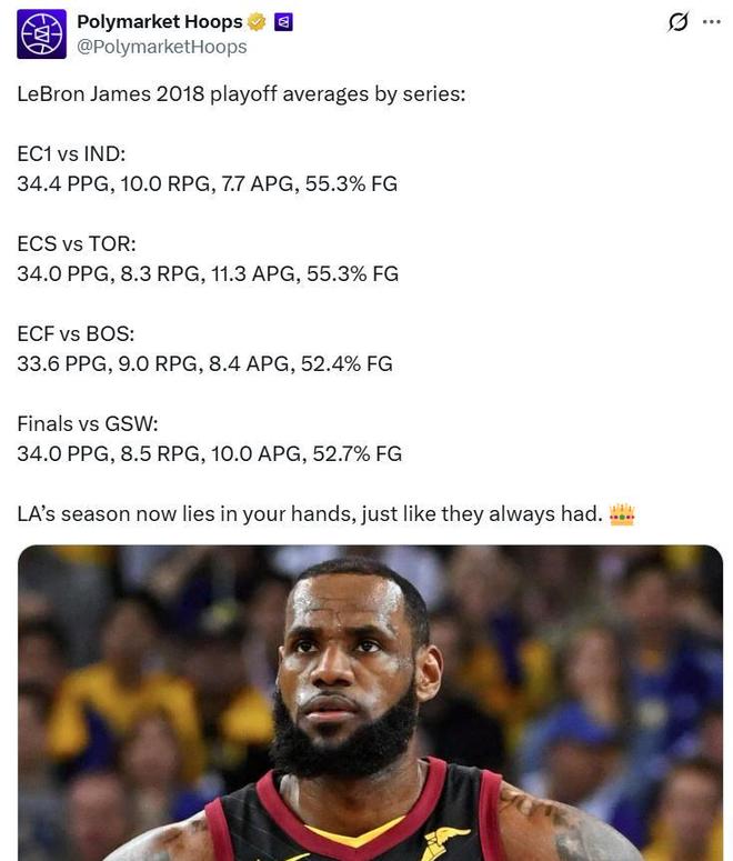 美媒Polymarket Hoops晒出18年“灭霸詹”数据配文道:“湖人的命运掌控在你的手中,正如往常一样。”