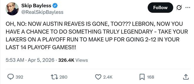 5年2.4亿要泡汤,里夫斯常规赛报销!湖人三巨头秒变41岁老詹单核