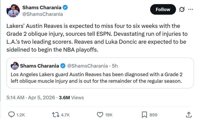 里夫斯的伤病不仅将影响他的续约前景,对于湖人队来说更是堪称毁灭性打击,因为在前一天球队大当家东契奇才因为腿筋二级拉伤常规赛报销。