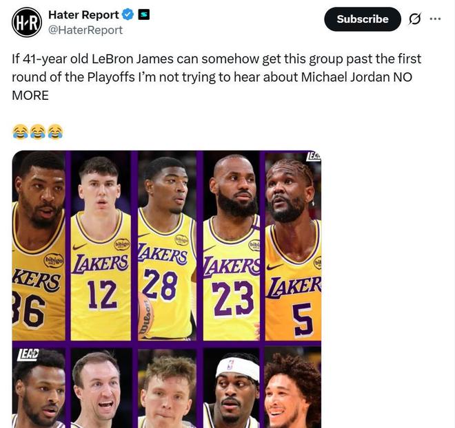 美媒HaterReport为詹姆斯造势到:“如果41岁的詹姆斯带领这样一支湖人闯过季后赛首轮,我就再也不想听到他和乔丹的任何讨论了!”